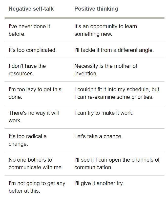 The Mayo Clinic offers a great article on positive thinking, including providing examples of reframing from negative to positive: